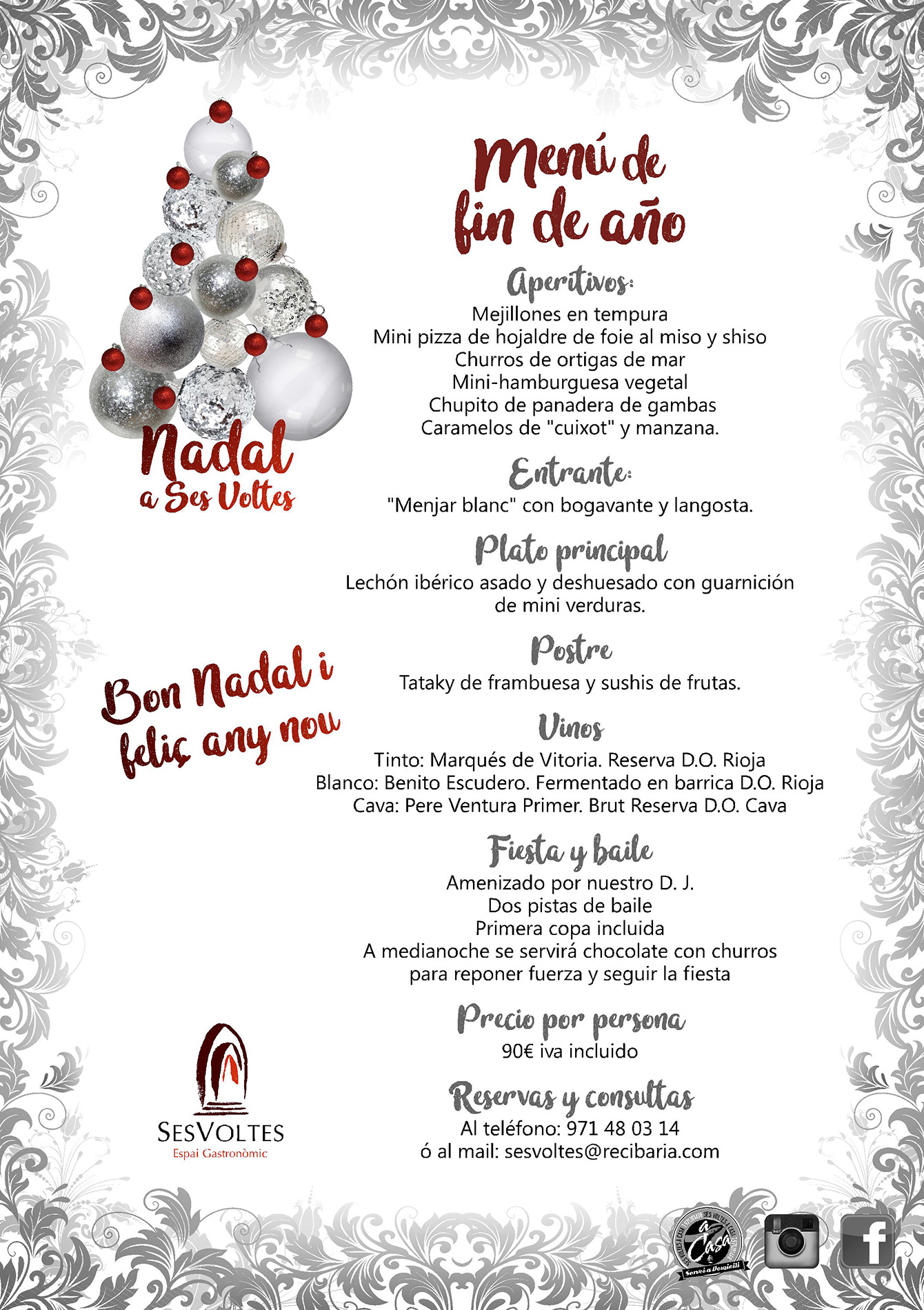 Y Para FIN de AÑO, tenemos preparada una gran fiesta gastronómica y también un fantástico baile con dos pistas, un Dj, Cotillón, Uvas, primera copa incluida y también por si fuera poco serviremos un chocolate con churros para que no decaiga el ánimo!