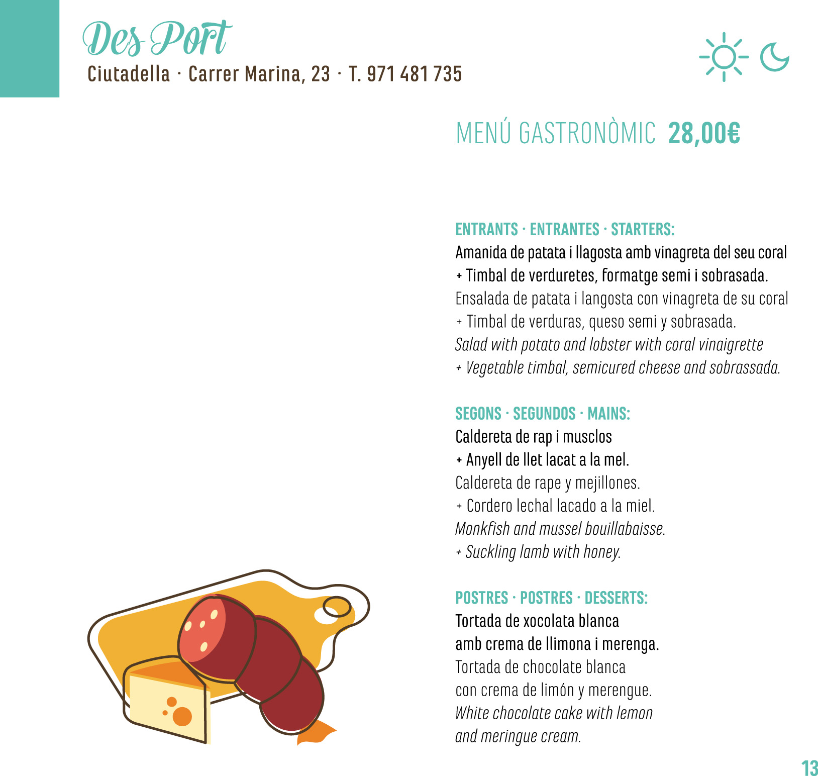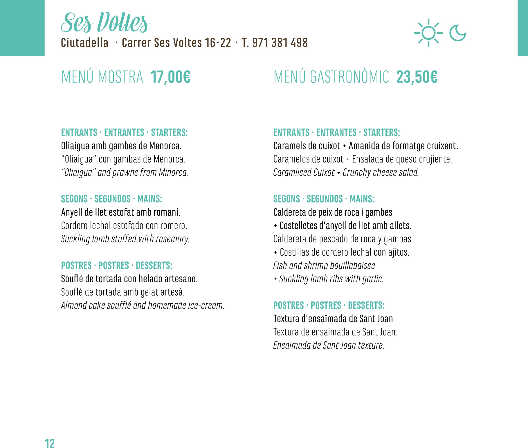 En la Mostra de Cuina del 2015, Ses Voltes preparó unas recetas de platos tradicionales con un toque moderno como la “textura” de Ensaimada de Sant Joan o los “caramelos de Cuixot” aunque los platos tradicionales de la cocina menorquina no faltaron como el Oliaigua sopa muy conocida y apreciada de Menorca. Desport situado en el Puerto de Ciutadella, ofreció unos platos exquisitos como la Ensalada de patata y langosta o la Caldereta de Rape y mejillones de Menorca.